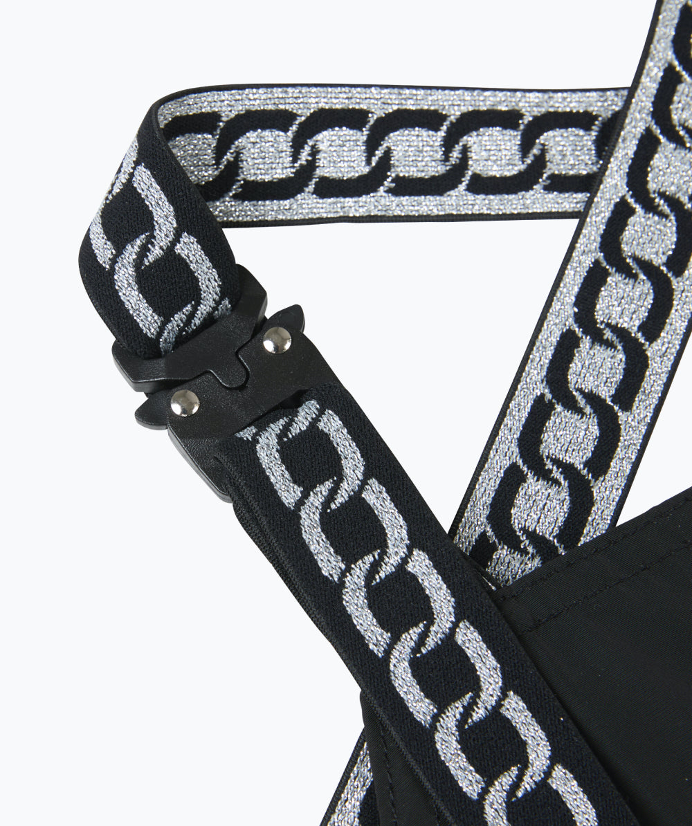 ユニークなシルバーメタルのロボットバックルが美しく、4つのポケットで空間感を演出、動くたびに目を引くデザインになっております。
